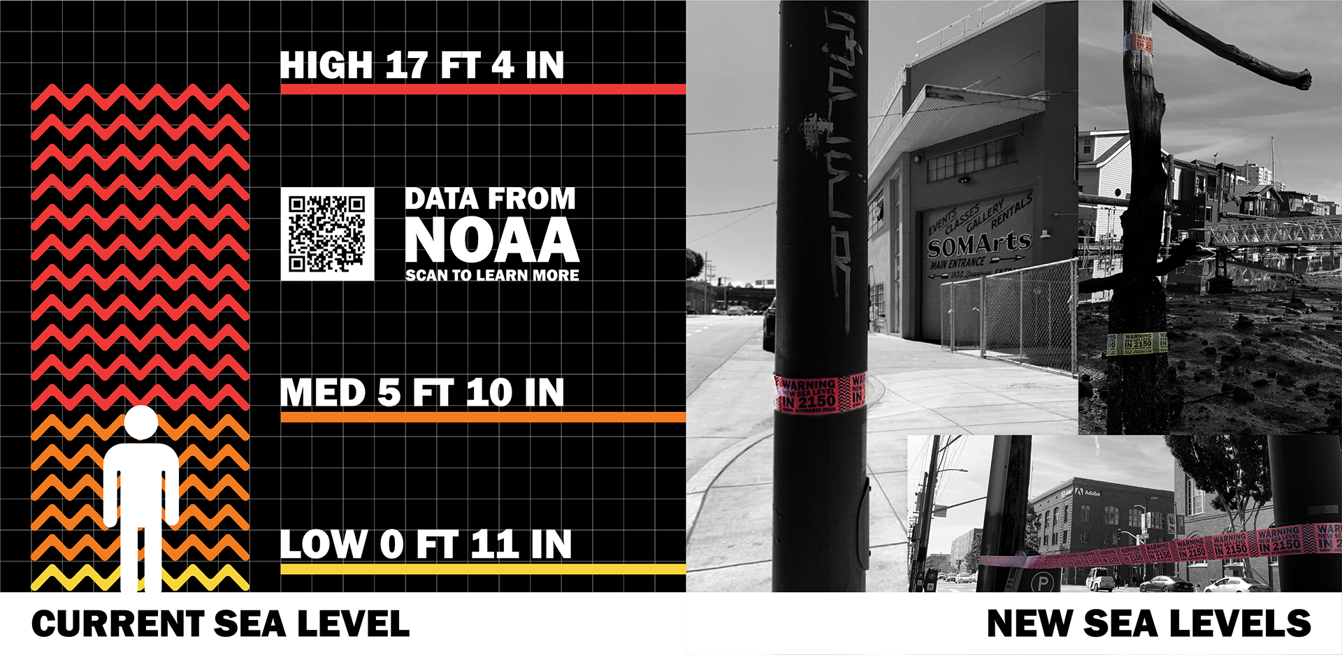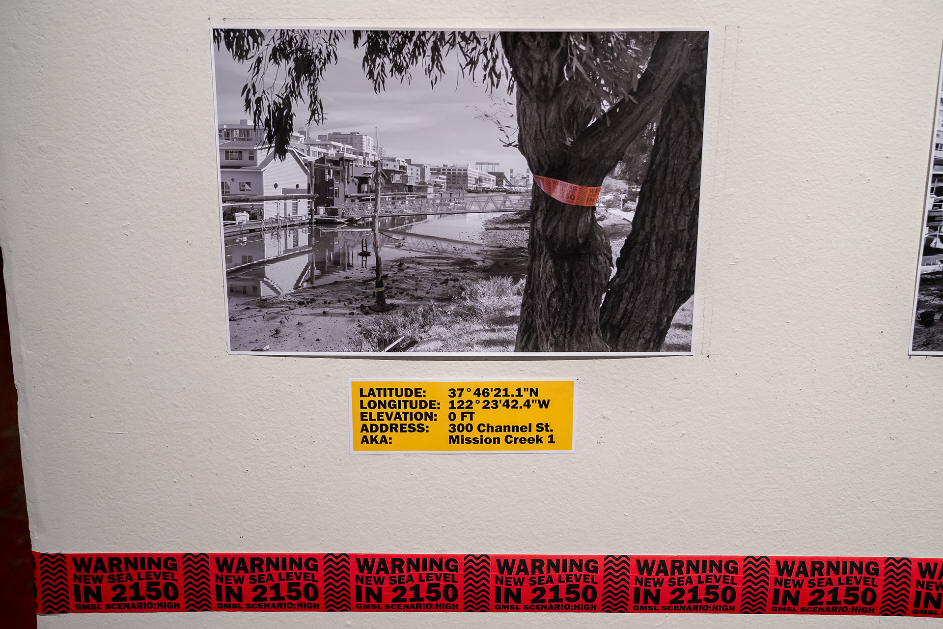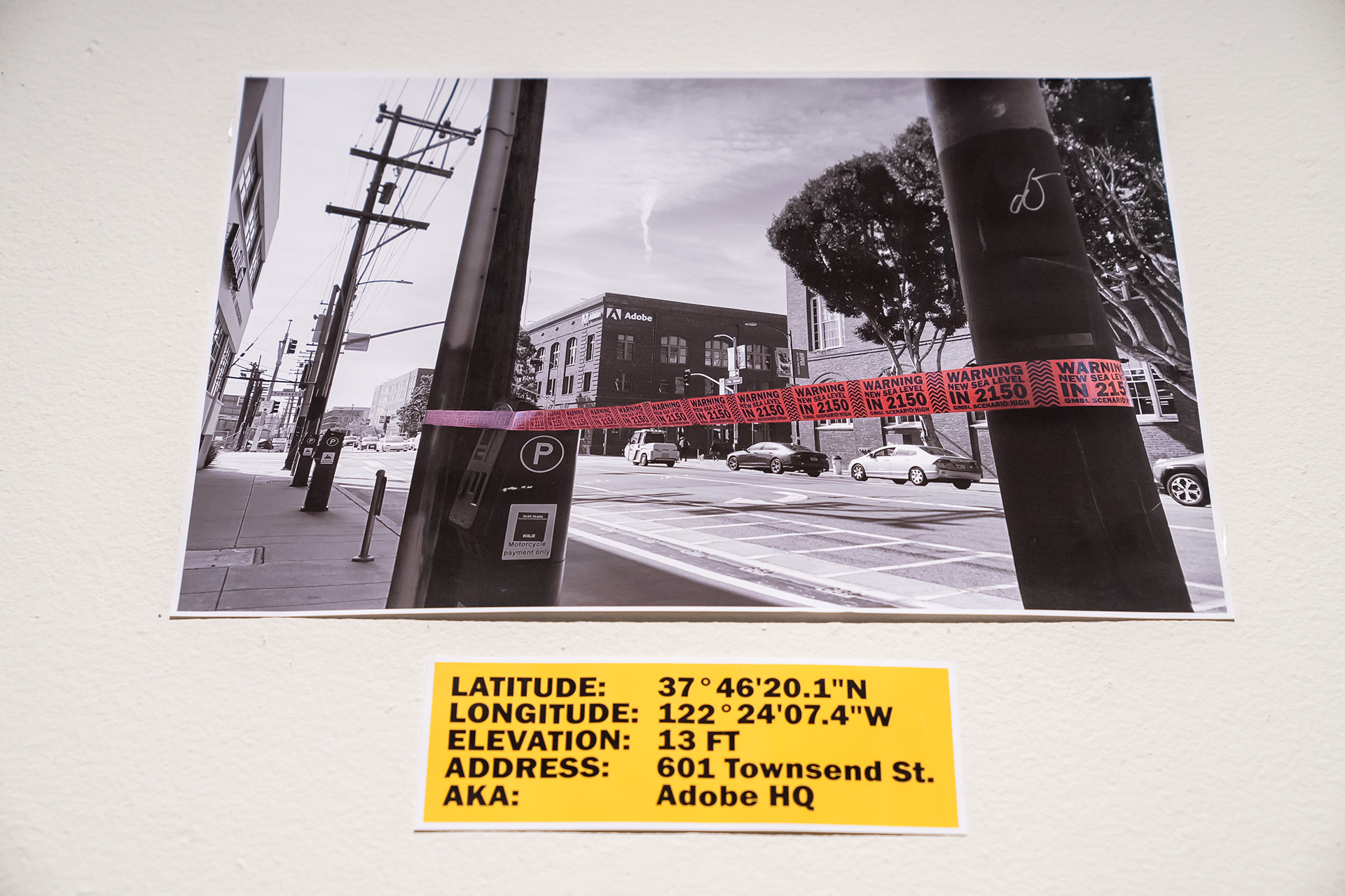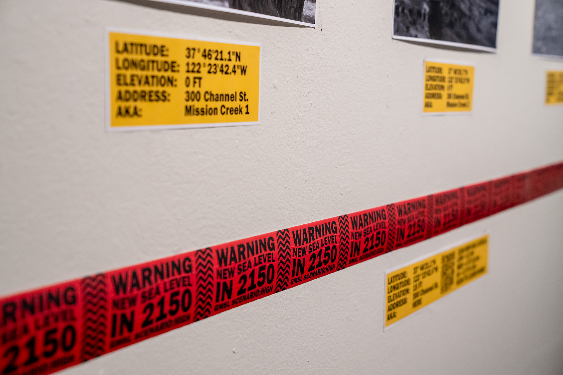 NEW SEA LEVEL is a project that aims to visualize the potential new water lines in San Francisco in 2150 due to the effect of climate change. With research gathered from the National Oceanic and Atmospheric Administration, I have designed 3 different caution tapes in accordance with 3 varying severity scenarios and juxtaposed against the city itself. The tapes simultaneously showcase not only how high the threat climate change poses in an intuitional and immediate kind of way, but also highlight what is potentially at risk in the process. Buildings, landmarks, history, people, livelihoods, our way of life itself; all are at stake here, all are at risk. Even SOMArts, the place where this exhibition takes place, is in the danger zone.