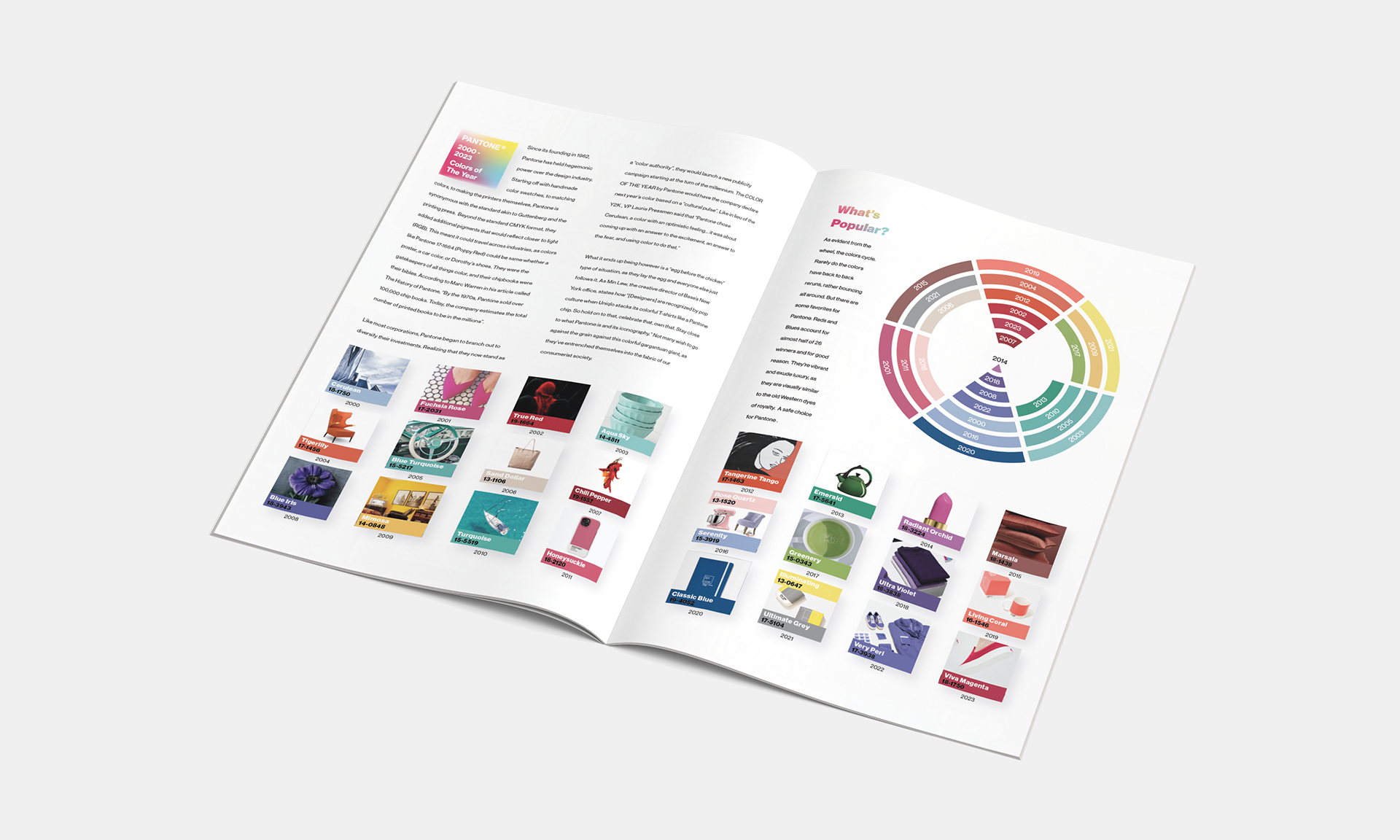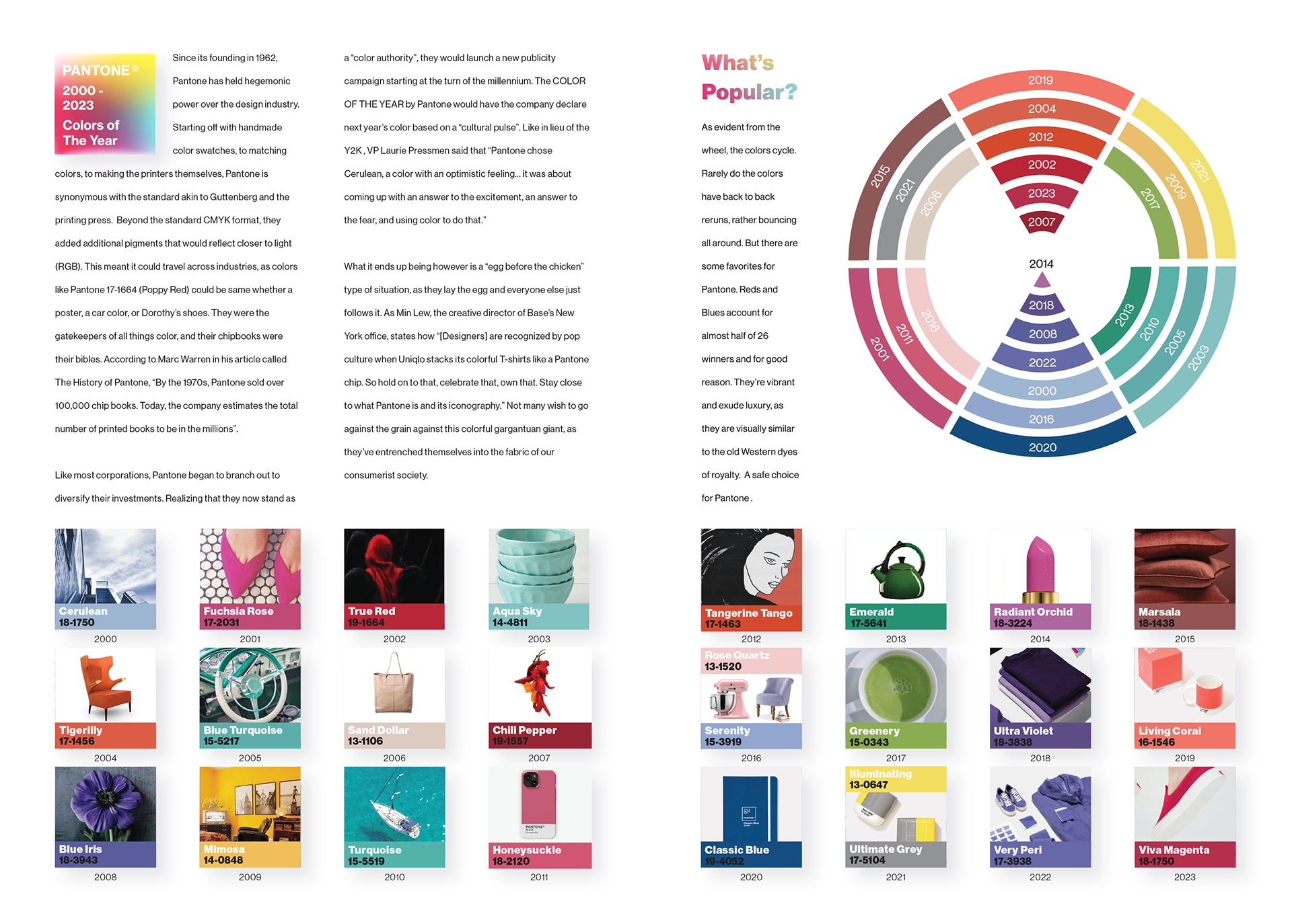 Tasked with creating a timeline data visualization for a magazine, I choose to analyze the last 26 winners of "Pantone's Color of the Year". Playful and professional, I used wide gutters and grid systems to make the information as disgustable as possible. But the pops of color and products add intrigue and enforces the notion that the awards are fundamentally rooted in consumerism. Not to mention how it incorporates the entire dataset in a fun and engaging way.