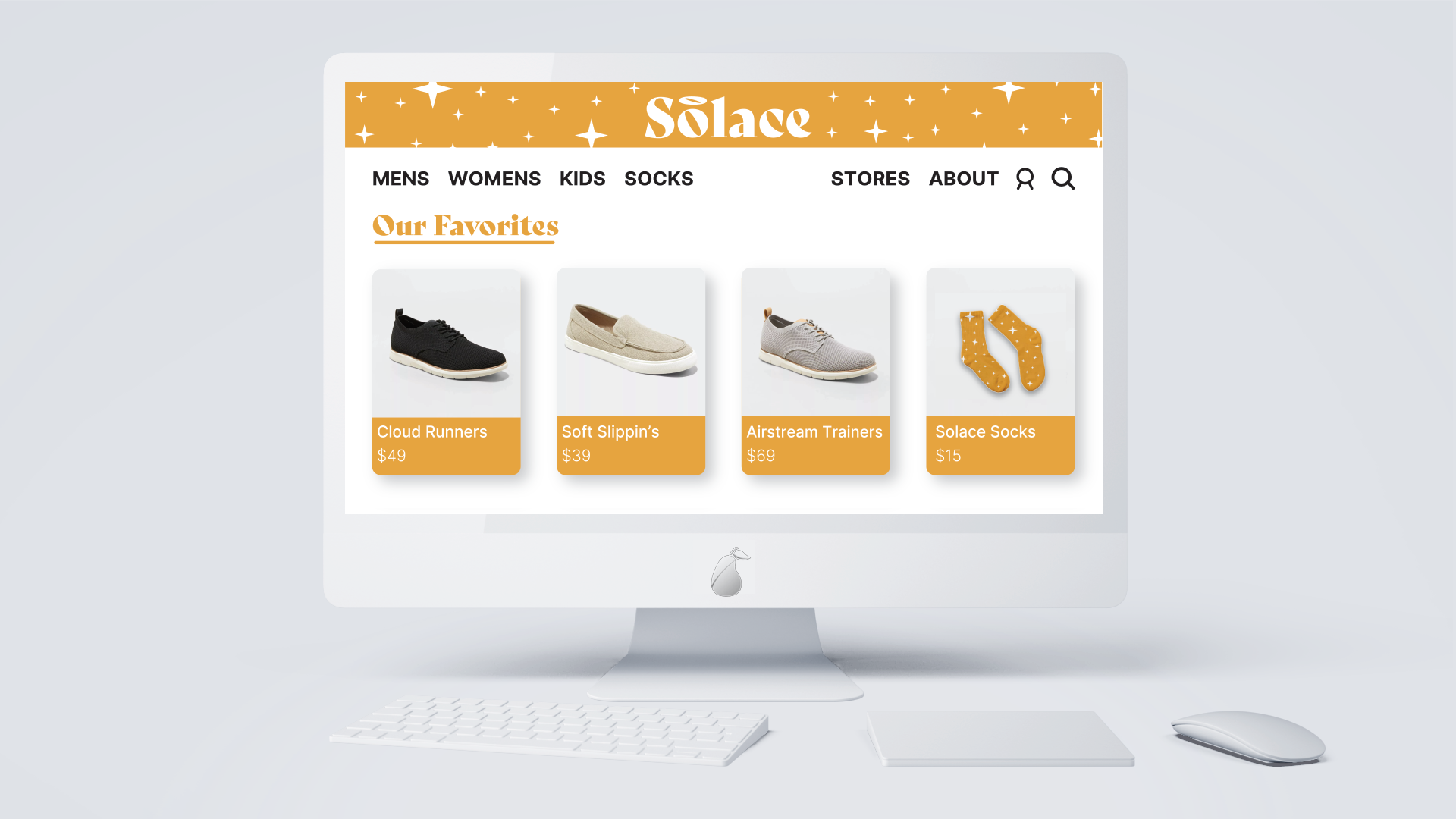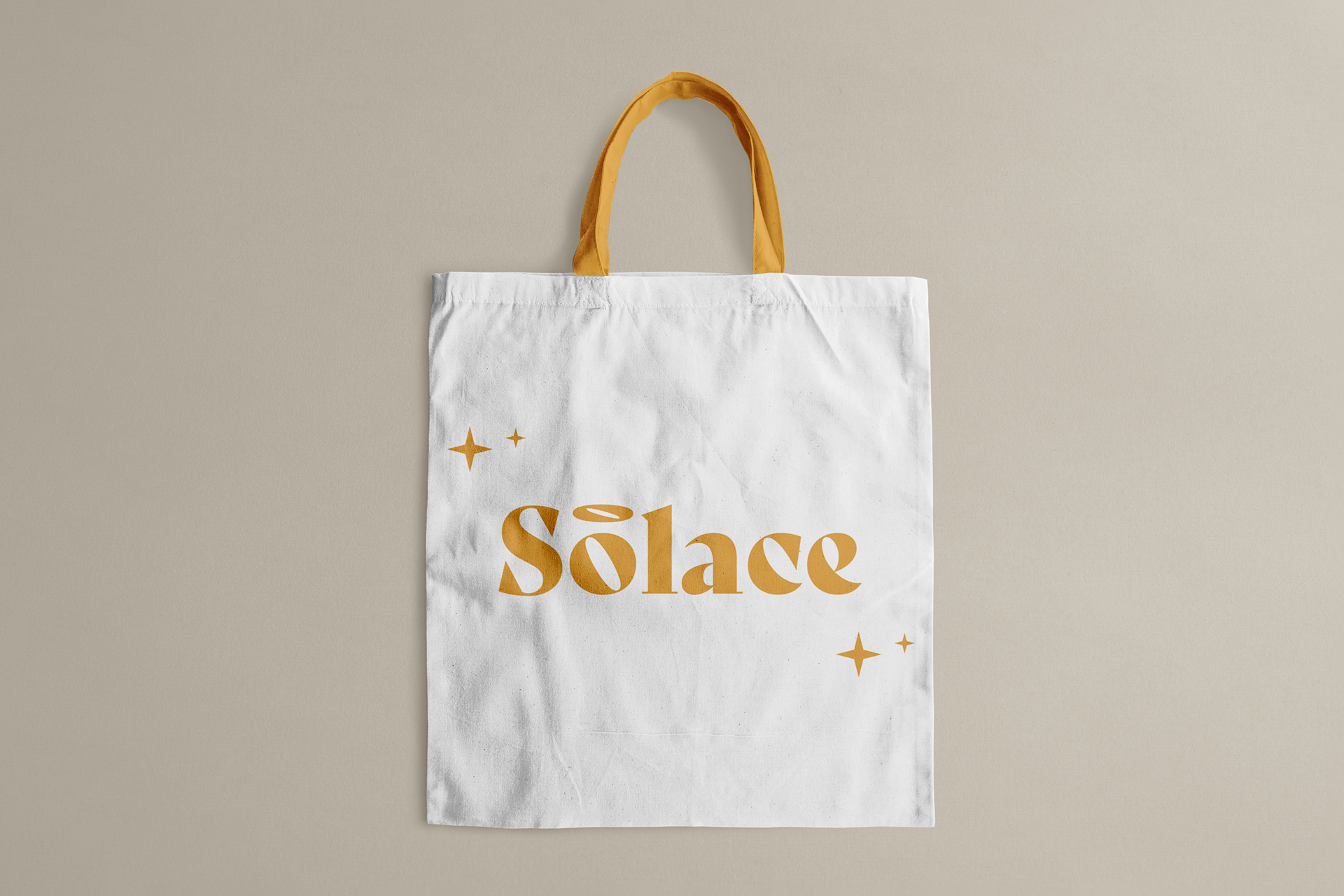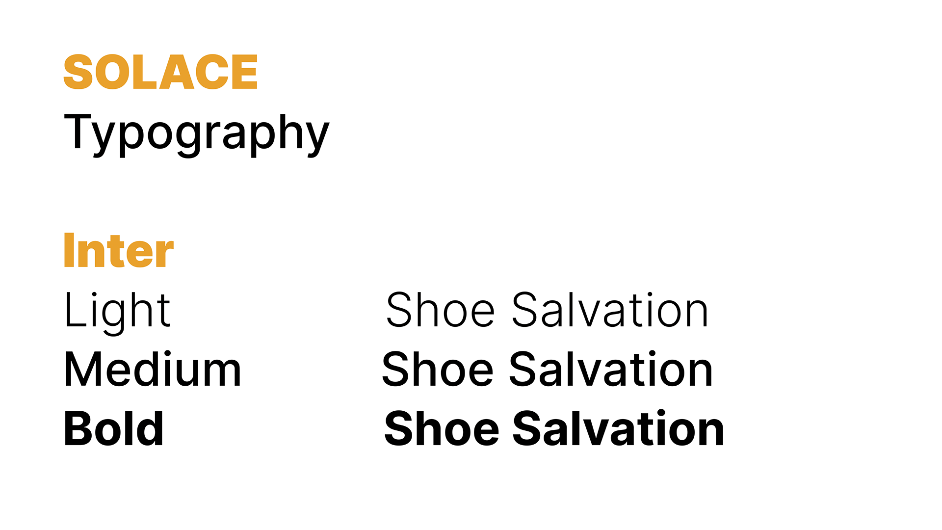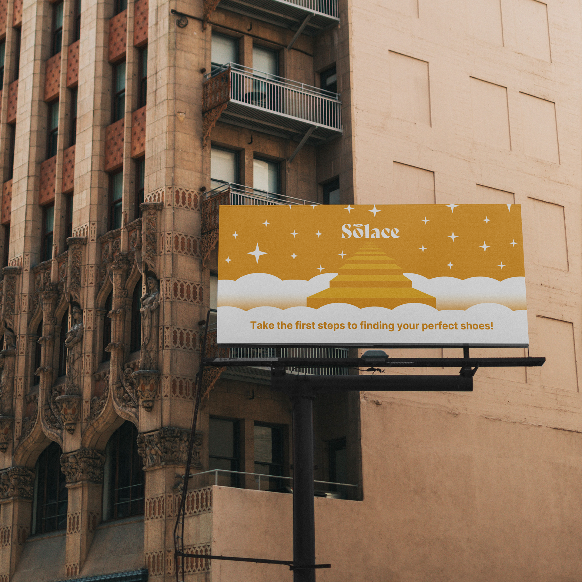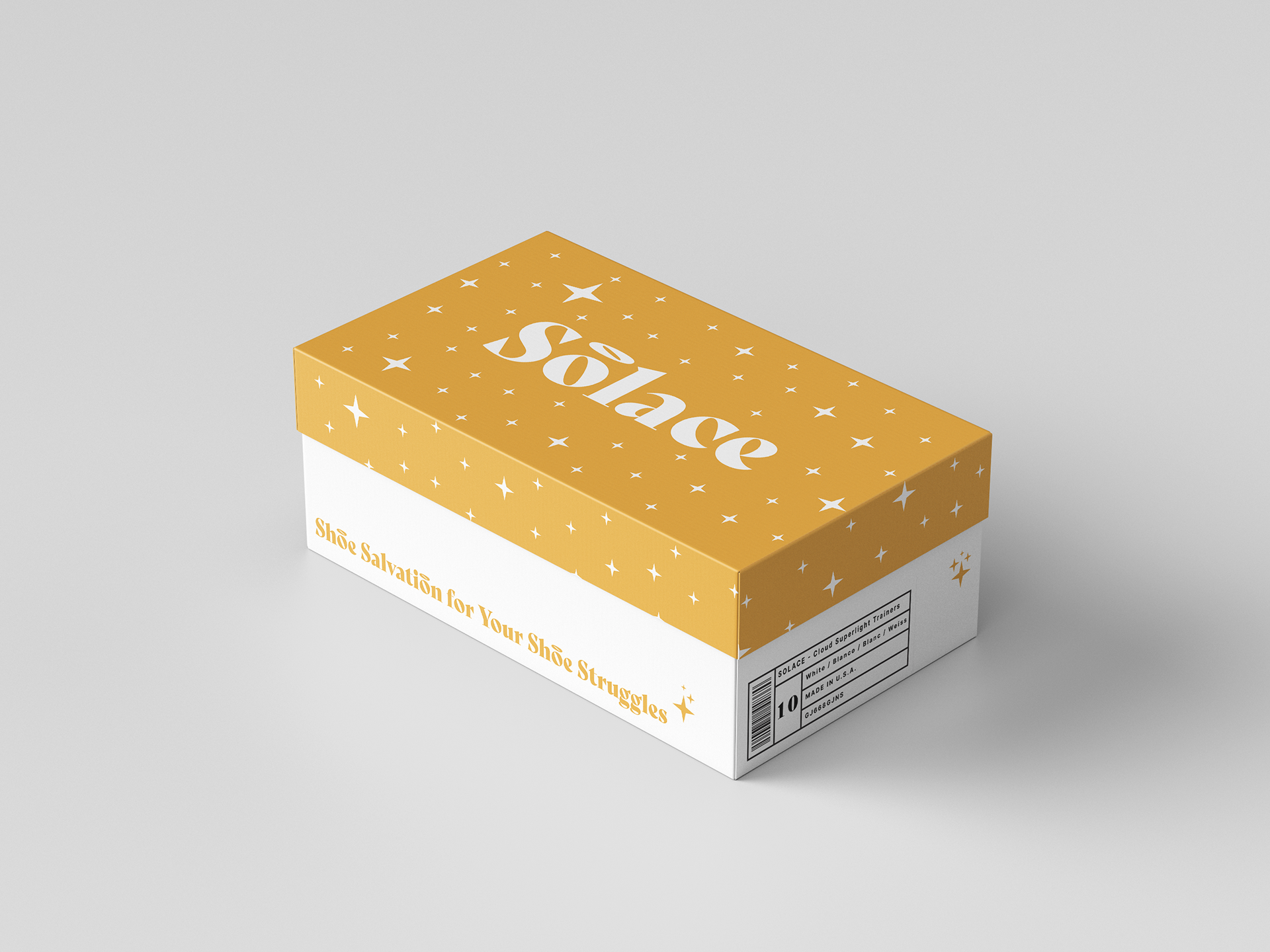 Solace is a fictional brand that specializes in selling stretchy shoes that are sure to fit everyone. The humble modern design style combined with a glittery gold palette ensures the target audience of weary souls that Solace's soles are the path to their shoe salvation!